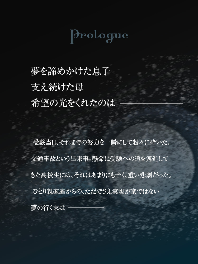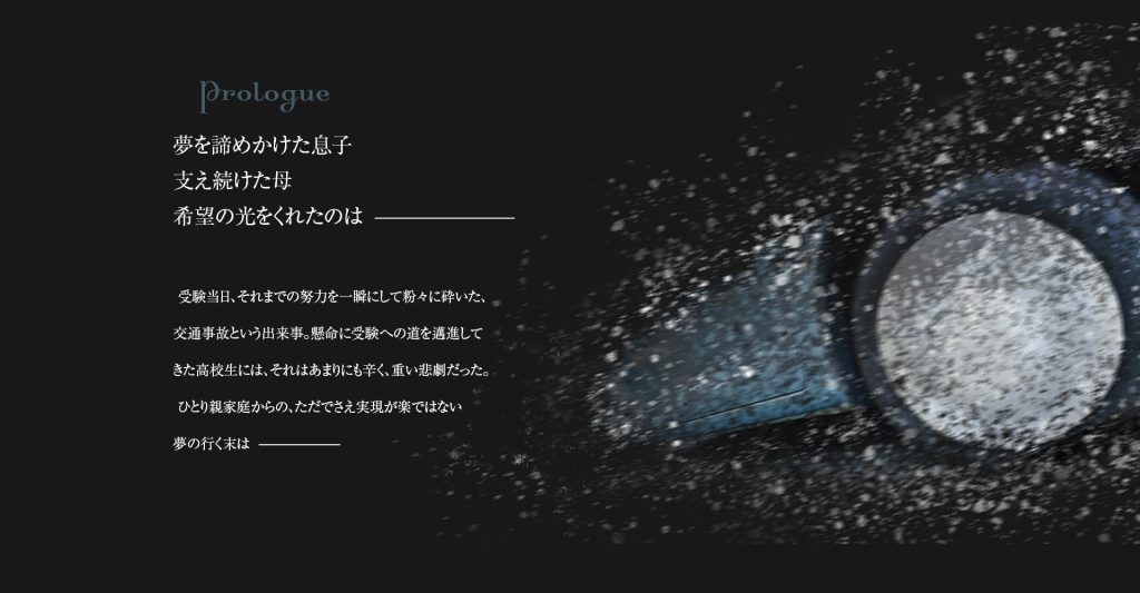 一方、遥斗は受験会場へ向かっていた。寒風が彼の体に吹きつけるなか、しっかりとその手には受験票が握られていた。朝は不安だらけだった遥斗だが、その受験票を見ていると不思議と嬉しさが込み上げてくる。その時、既に全力でやり切った達成感すら感じていた。「あとは本番で時間と戦い、焦ることなく今まで積み上げてきたものを吐き出すだけだ」そう思いながら横断歩道を渡っていたとき、突如として視界に現れた車。遥斗の瞳が車の姿を捕えた時には既に遅く、遥斗には猛スピードで近づいてくる車の前で目を見開いて立ち尽くすことしか、できなかった。それは突然の、事故だった。